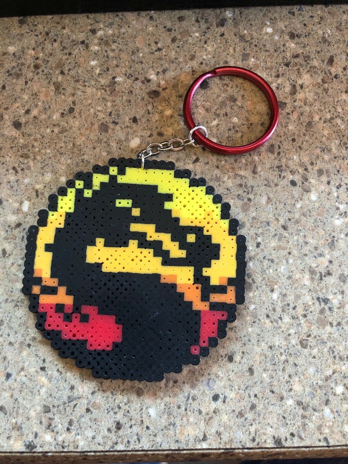 handmade Mortal Kombat dragon crest Charm made from perler mini bead art. On a red split ring keychain.