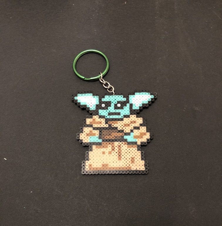 Handmaid Baby Yoda made of perler beads on a split ring.