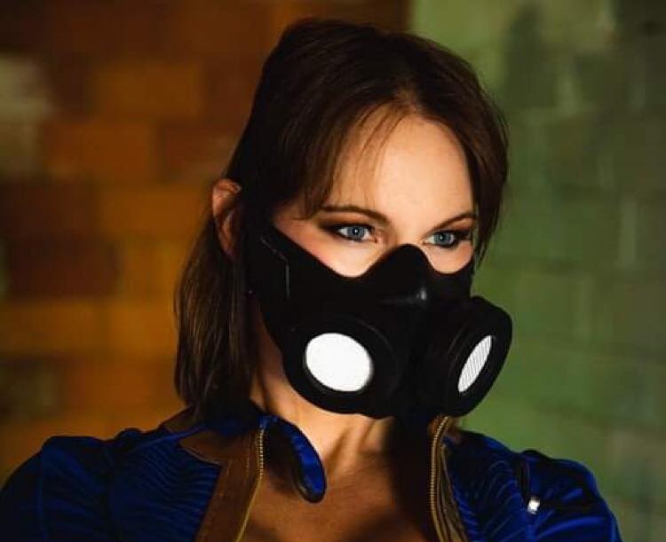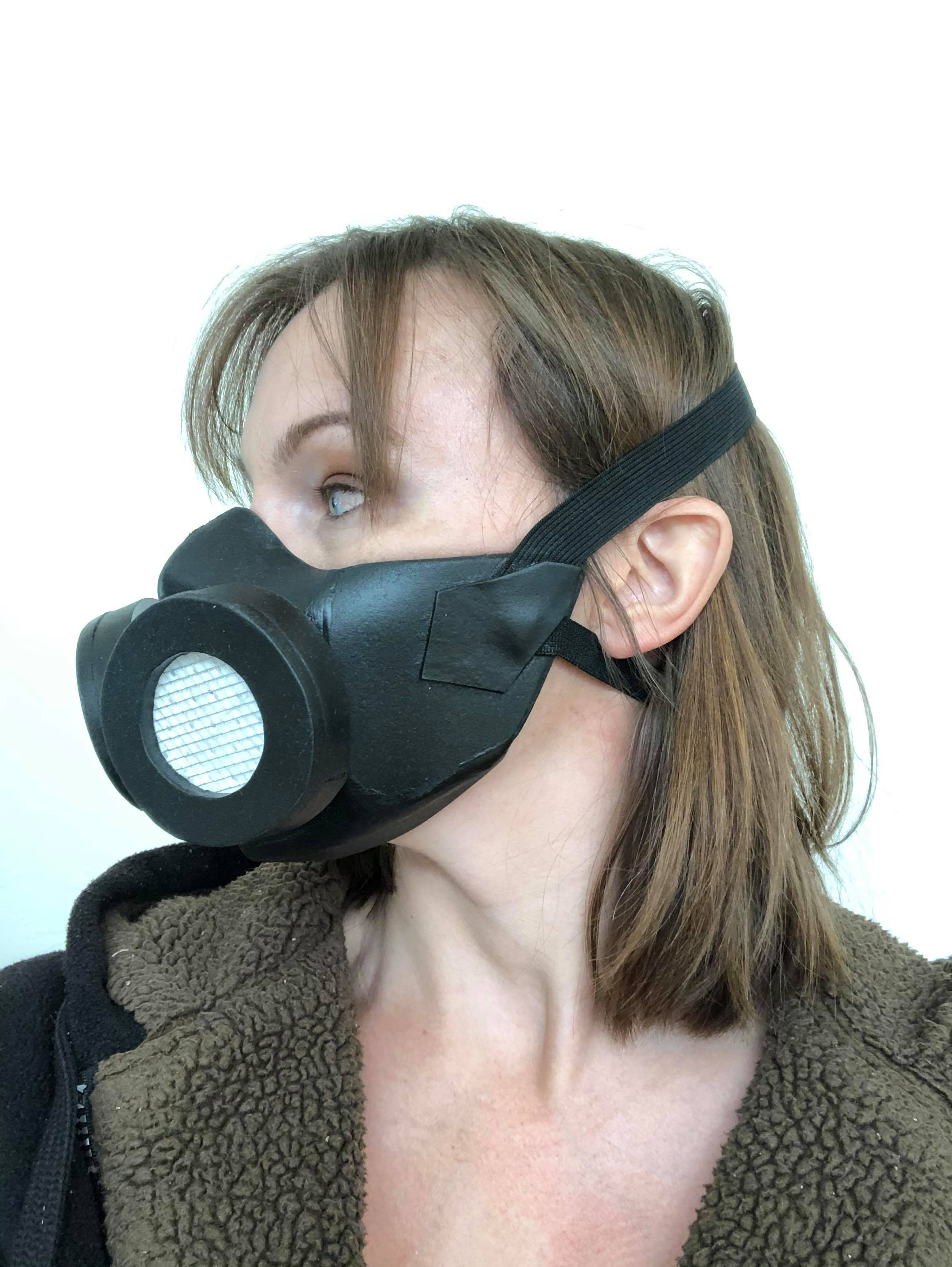 Traditional symmetrical respirator design HEPA filter facemask, rubber coated, with resin details on the sides. Dual head elastics with utility clip on lower elastic.